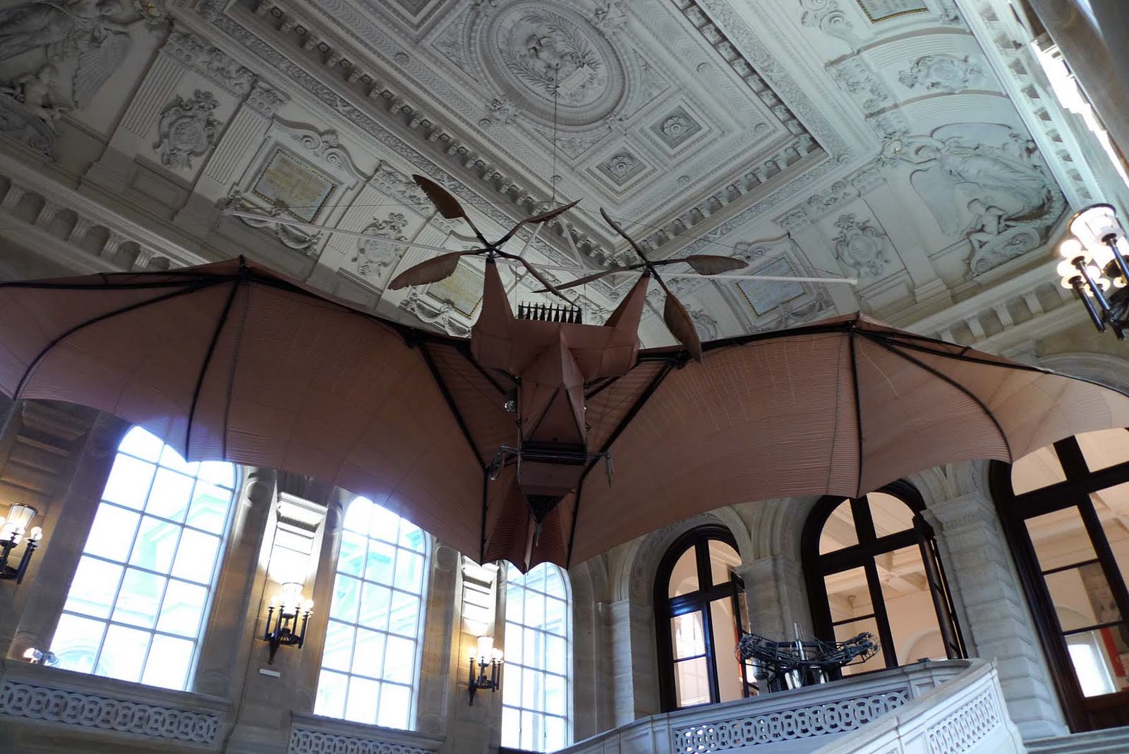For example, when Americans think of the first flight, they think of Kitty Hawk.  In France, Clément Ader (1841-1925) figured if a bat could fly, then all Parisians should  climb aboard a batmobile and flap around the city.  In 1897,  he claimed his Avion III stayed airborne for about 900 feet, or did it?  No one is alive today to confirm it, but as you stare up at this creature, the sheer enchantment of it is tangible.
