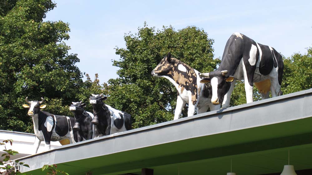 The cows herald the pizza cafe and outdoor movie theatre in the park.
