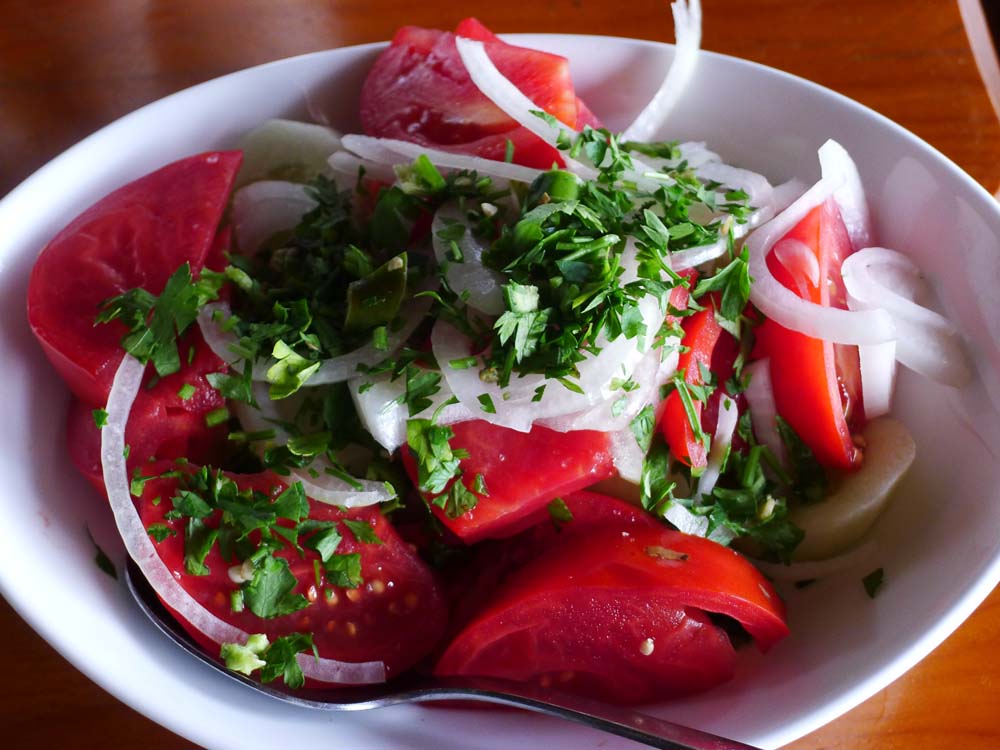 The southern climate makes for a ubiquitous default dish of fresh cucumber and tomato.