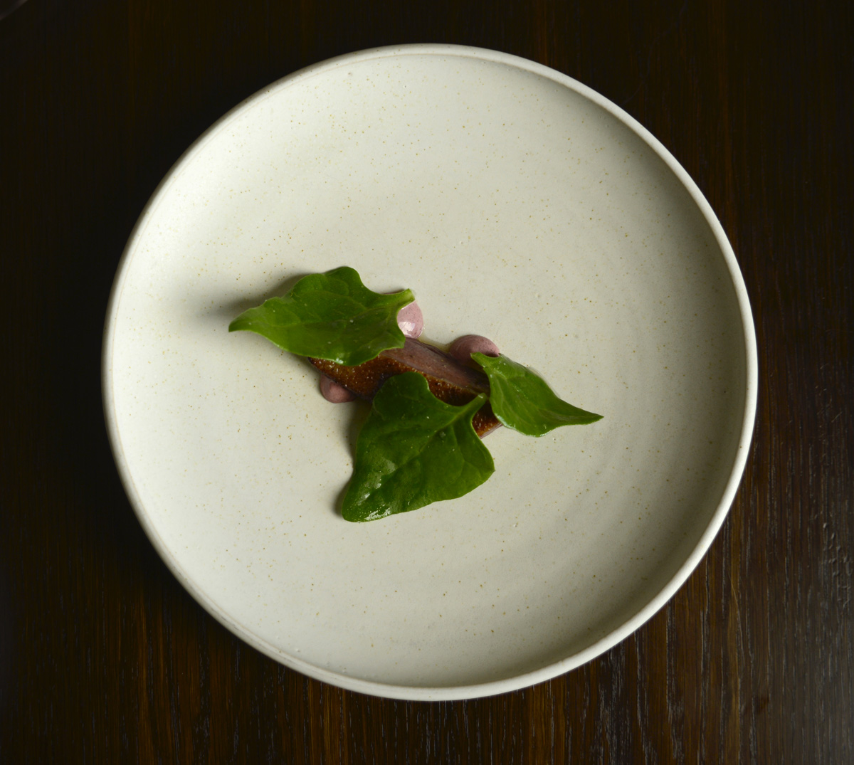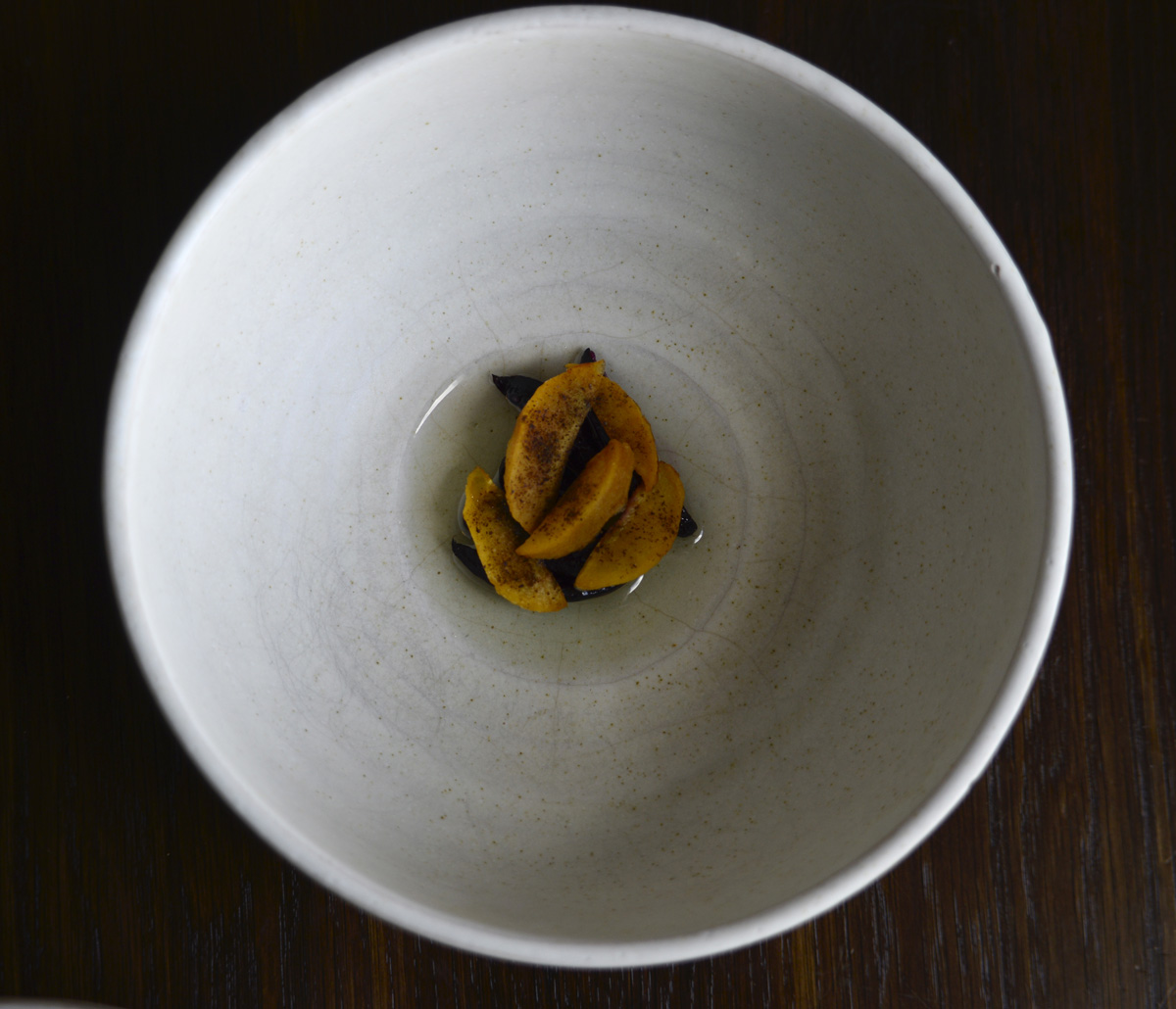 After the richness of the egg yolk, we welcomed the zesty mélange of beets, red seaweed, and slightly dried plums in a splash of almond oil.
