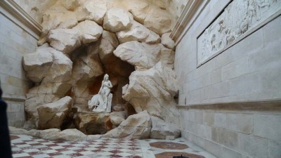 Since Marie Antoinette found Rombouillet rather boring, Louis XVI built her the little round La Laiterie de la Reine (the Queen’s Dairy) out in the fields as an amusement.  It is a miniature milking barn of sorts, built in pristine stone with marble floors, classical style sculpture depicting frolicking nymphs and putti cavorting with goats and cows. There is even a charming little nymphaeum attached. Still, it’s hard to imagine Marie Antoinette sitting here on a three legged stool, yanking on a cow udder in giddy delight.  Seems like this place is more about Louis than Marie.  For us, it is a precious little architectural gem not to be missed.