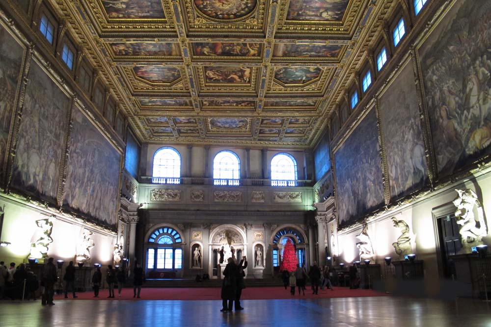 Less than 50 years later the Medici made a come-back. Grand Duke Cosimo I de’ Medici moved into the huge crenellated fortress/town hall that housed the ruling body of Florence (Palazzo della Signoria). He hired painter and architect Giorgio Vasari to enlarge and redecorate to wretched excess. The majestic Hall of the 500 is host to massive Vasari murals depicting the triumphant Florentines slaughtering their neighbors in Siena and Pisa.