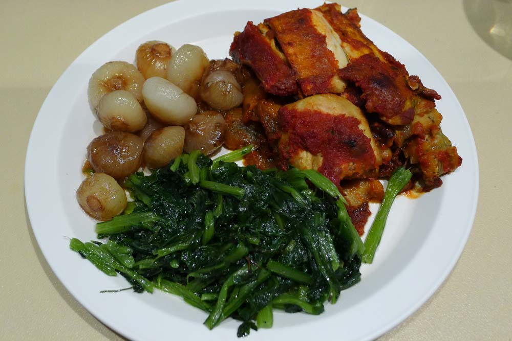 Eggplant Parmesan, carmelized onions and a mystery green vegetable were satisfyingly tasty.