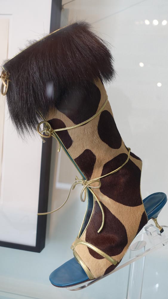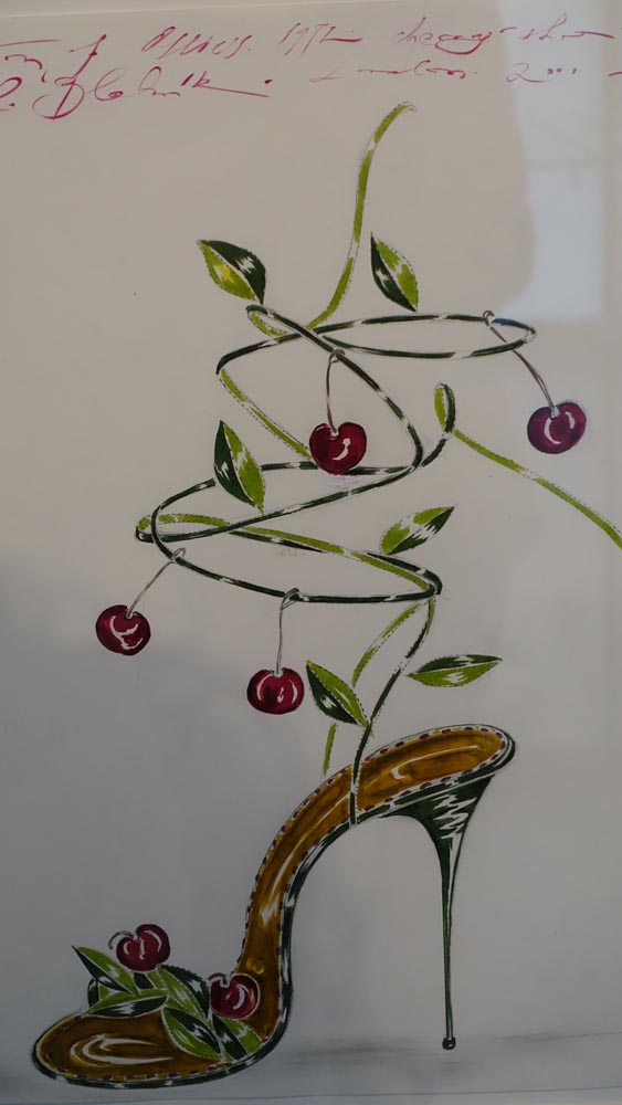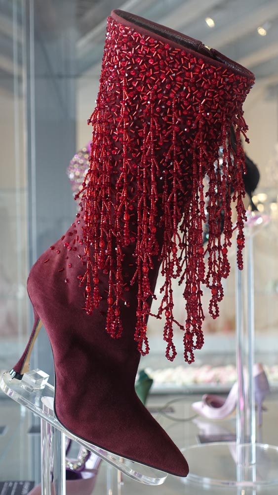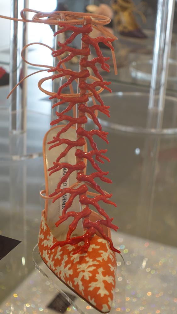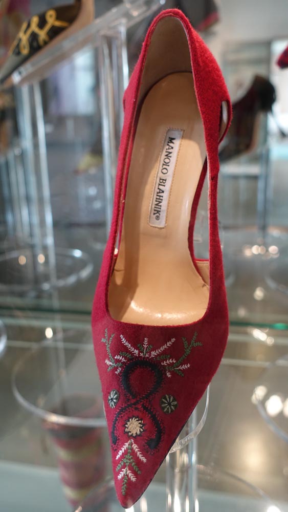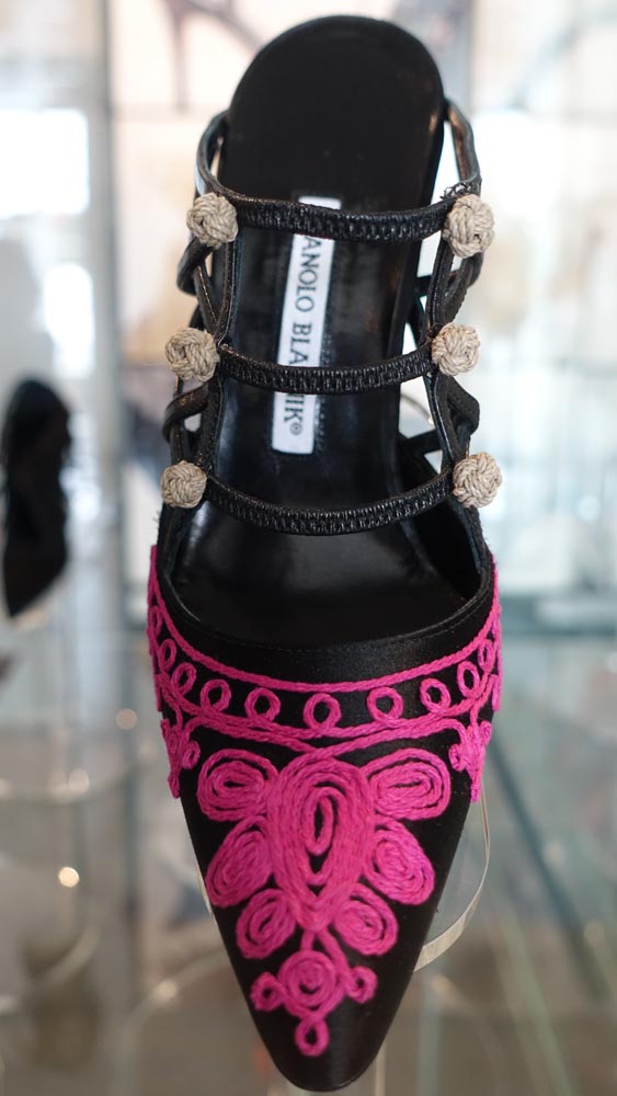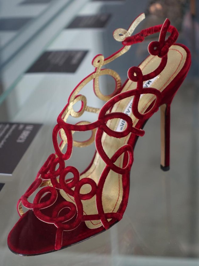 Curator Cristina Carrillo de Albornoz describes Manolo’s style as “…the ideal balance between beauty, quality and comfort.”  COMFORT!!!  What about all those women who’ve had the Cinderella treatment, meaning corrective foot surgery to squeeze  into his shoes…then again, maybe it was all worth it. You be the judge.