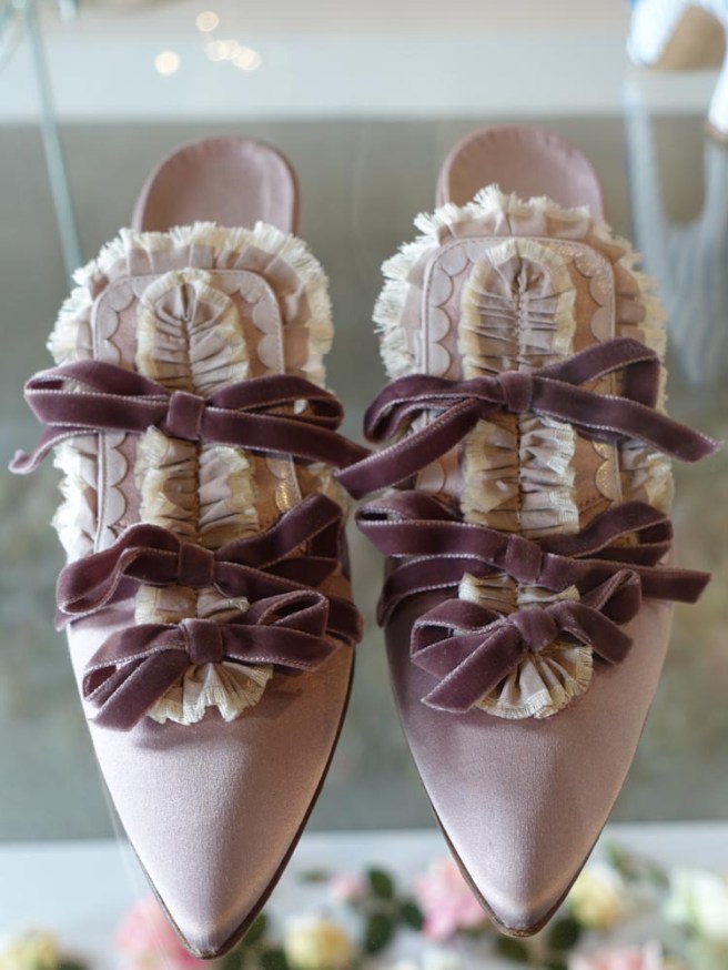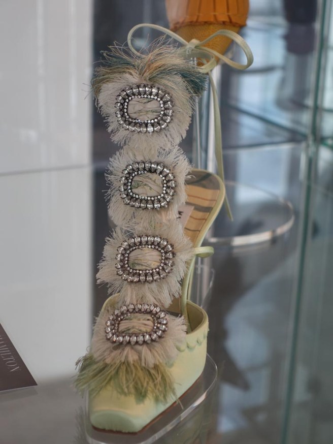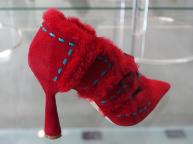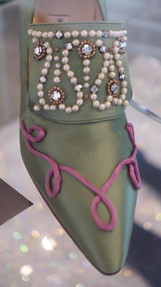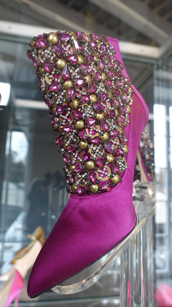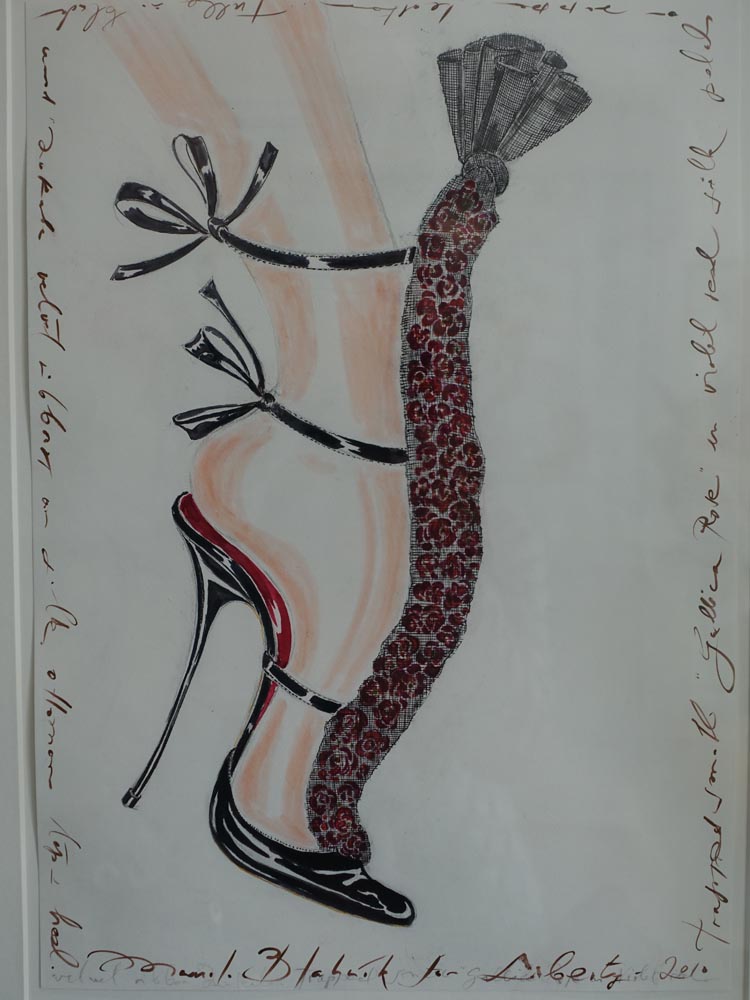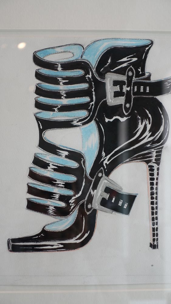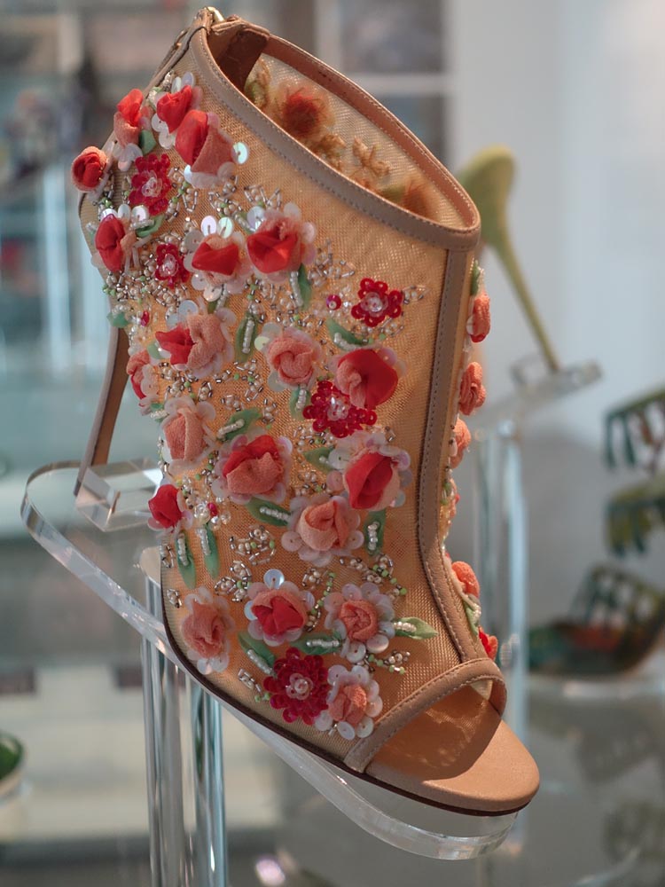 Curator Cristina Carrillo de Albornoz describes Manolo’s style as “…the ideal balance between beauty, quality and comfort.”  COMFORT!!!  What about all those women who’ve had the Cinderella treatment, meaning corrective foot surgery to squeeze  into his shoes…then again, maybe it was all worth it. You be the judge.