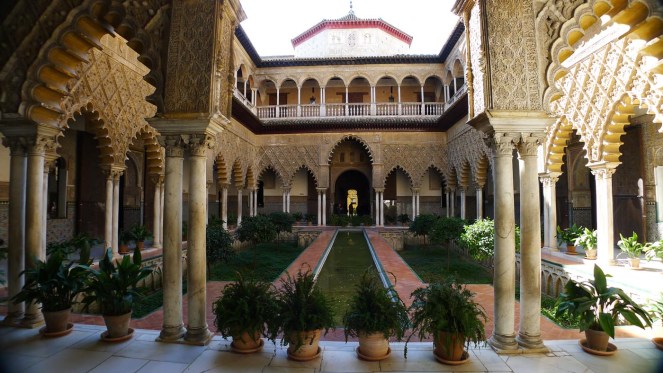 The ALCÁZAR is the brilliant Mudéjar Palace first begun by Spanish King, Pedro the Cruel, in 1361. For almost 7 centuries it has been the dream house of  Spanish Kings. Mudéjar means Christian Spanish architecture strongly influenced by Islamic motifs and culture.