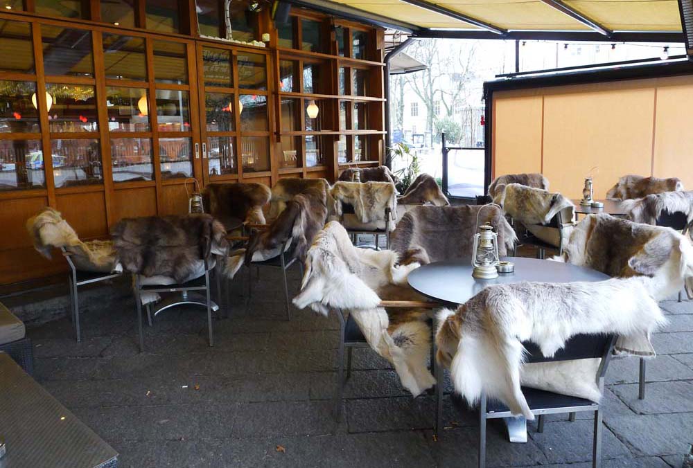 When it’s snowing at the outdoor cafe, just throw a reindeer skin over yourself and enjoy the acquavit, Cheers!